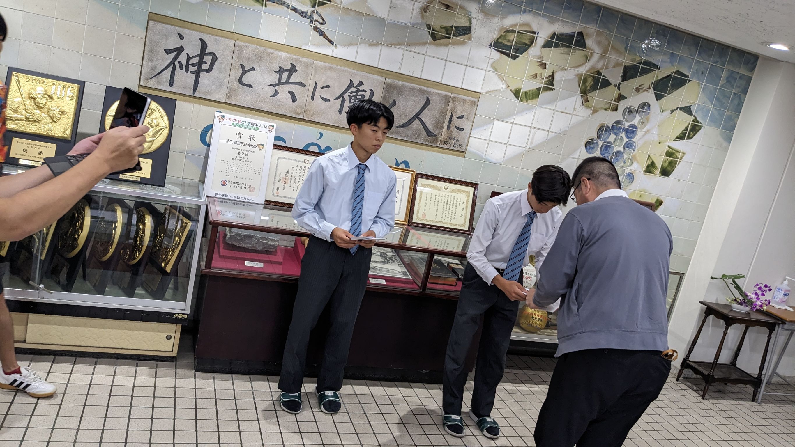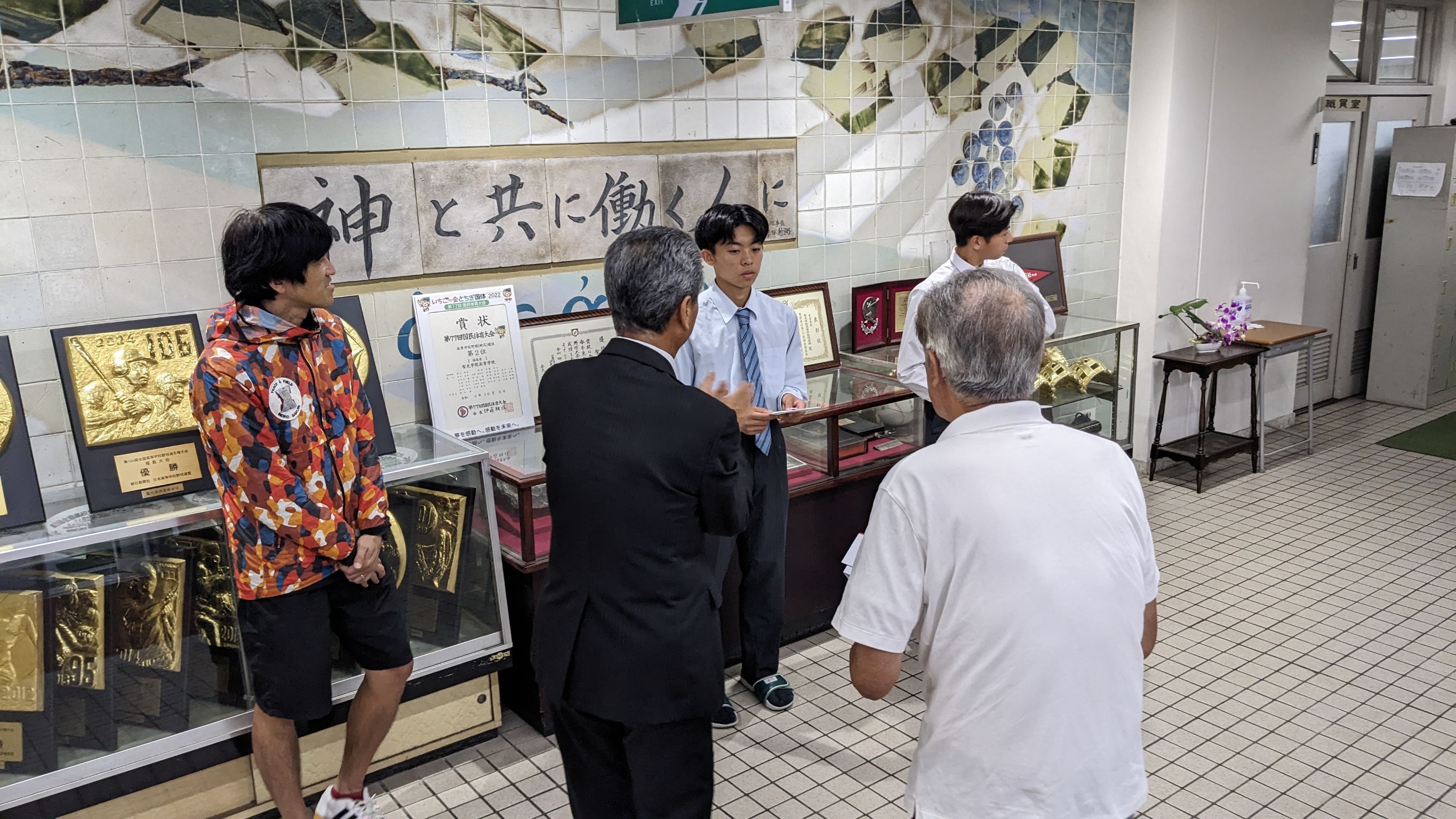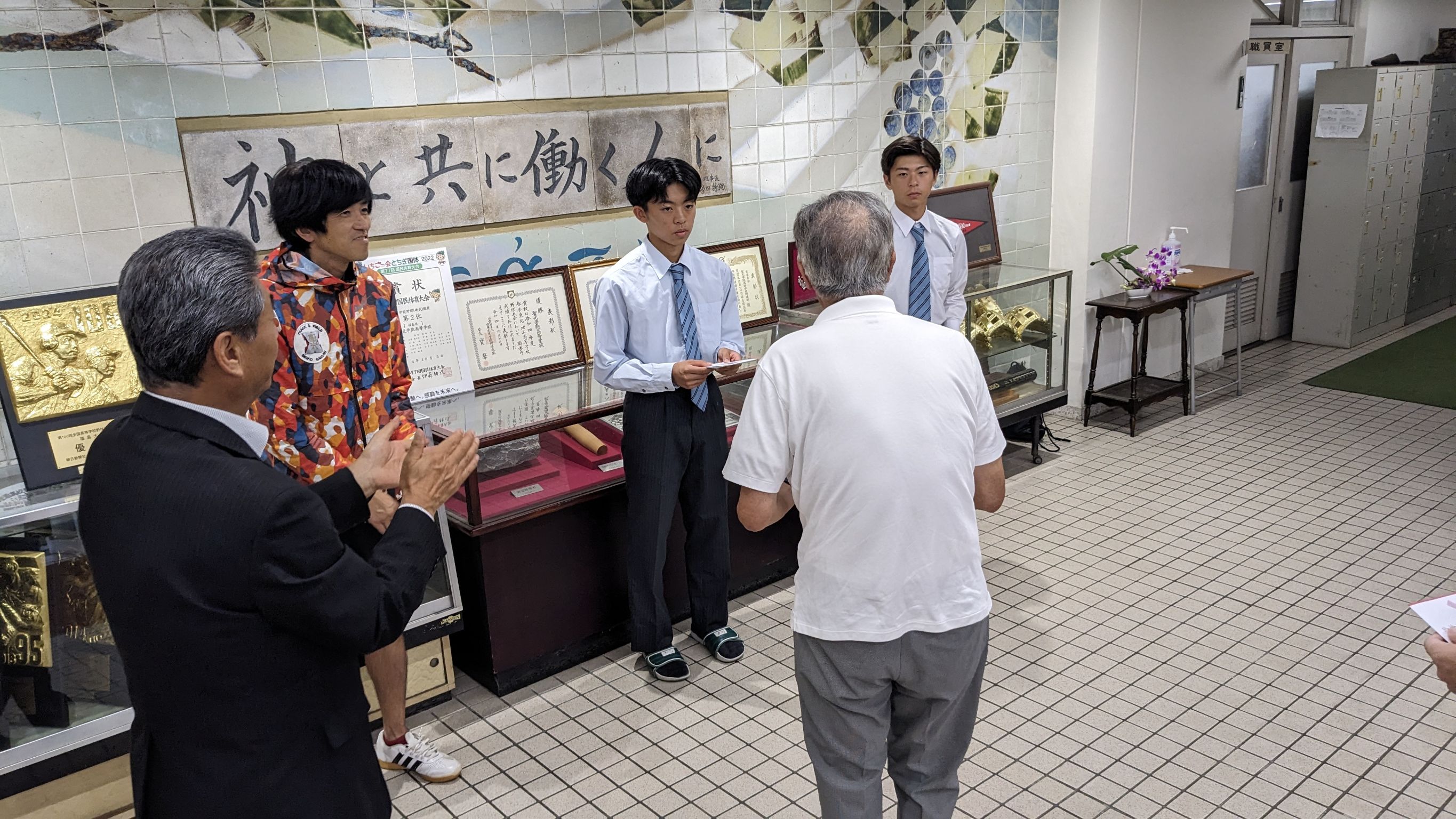東北大会出場の陸上部高橋礼央(2SC)さんと、全国大会出場の馬術競技矢内玖利歩(2EM)さんの両名に大会出場激励金が手渡されました。