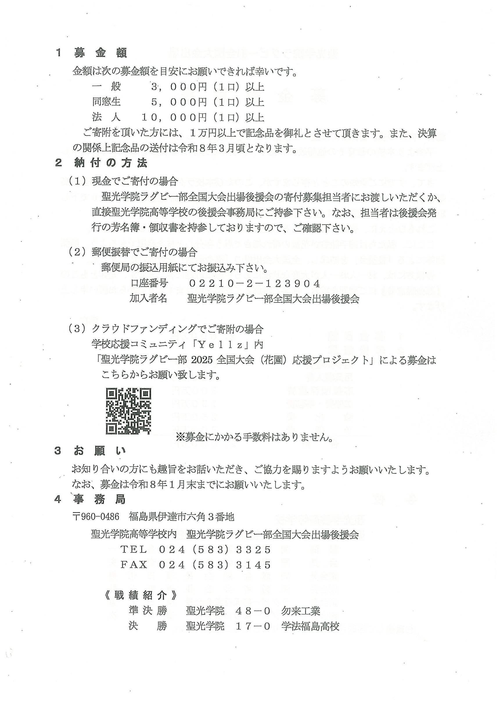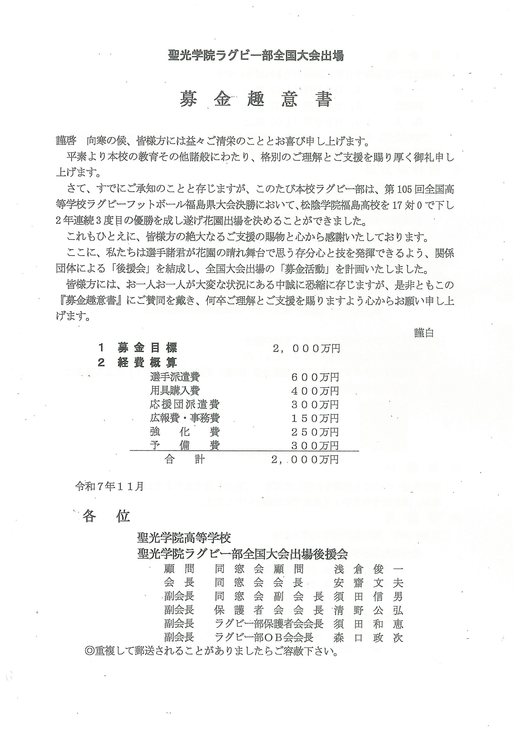 ラグビー部全国大会出場後援会立上会発足 第105回全国高等学校ラグビーフットボール大会に出場するラグビー部を祝し、この度ラグビー部全国大会出場後援会が立ち上げられ、立ち上げ式が開催されました。 また、大会出場費用を算出しその費用の一部を募金に依って補いと考えております。皆様からの温かいご支援を賜りたく存じます。 予算と募金目標額は以下に添付の資料をご覧ください。